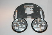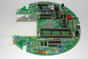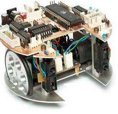 Der c't-Bot ist ein mobiler Roboter mit zwei Rädern, eine runde Grundflaeche der Größe einer CD, zahlreichen Sensoren und einem Mikrocontroller (Atmega32), der in C programmiert wird.